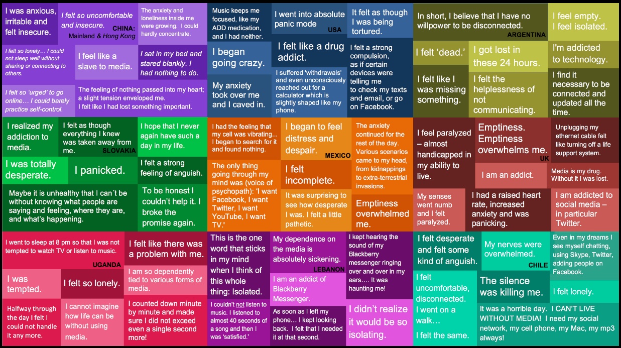 “Media is my drug; without it I was lost,” said one student from the UK. “I am an addict. How could I survive 24 hours without it?”